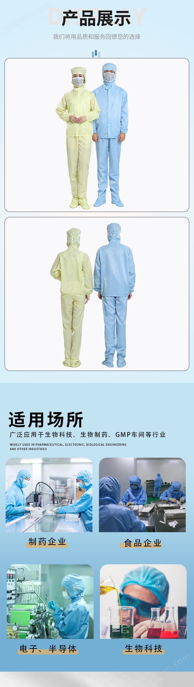 Split pharmaceutical clean suit A jacket style1/2 diagonal 0.5 stripe anti-static fabric: long filament polyester brazing+conductive filament fiber; High quality crocheted elastic with YKK high temperature and humidity resistant sterilization zipper.