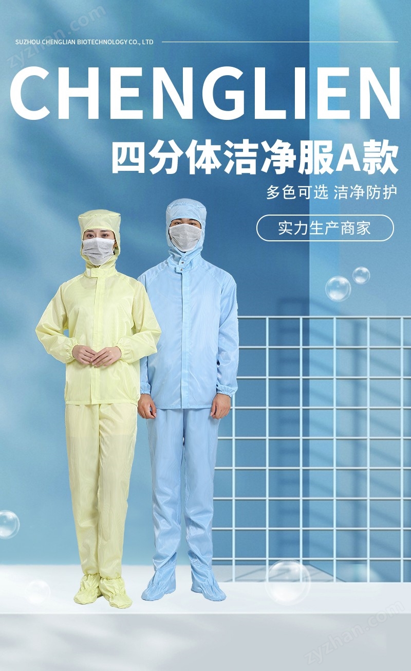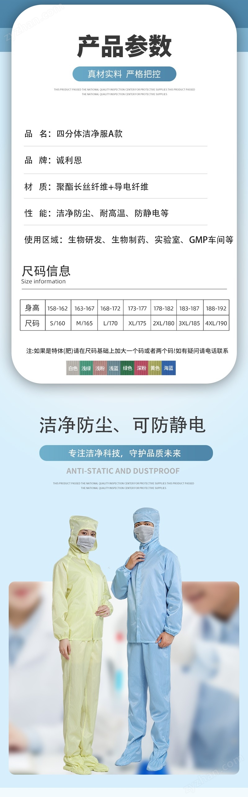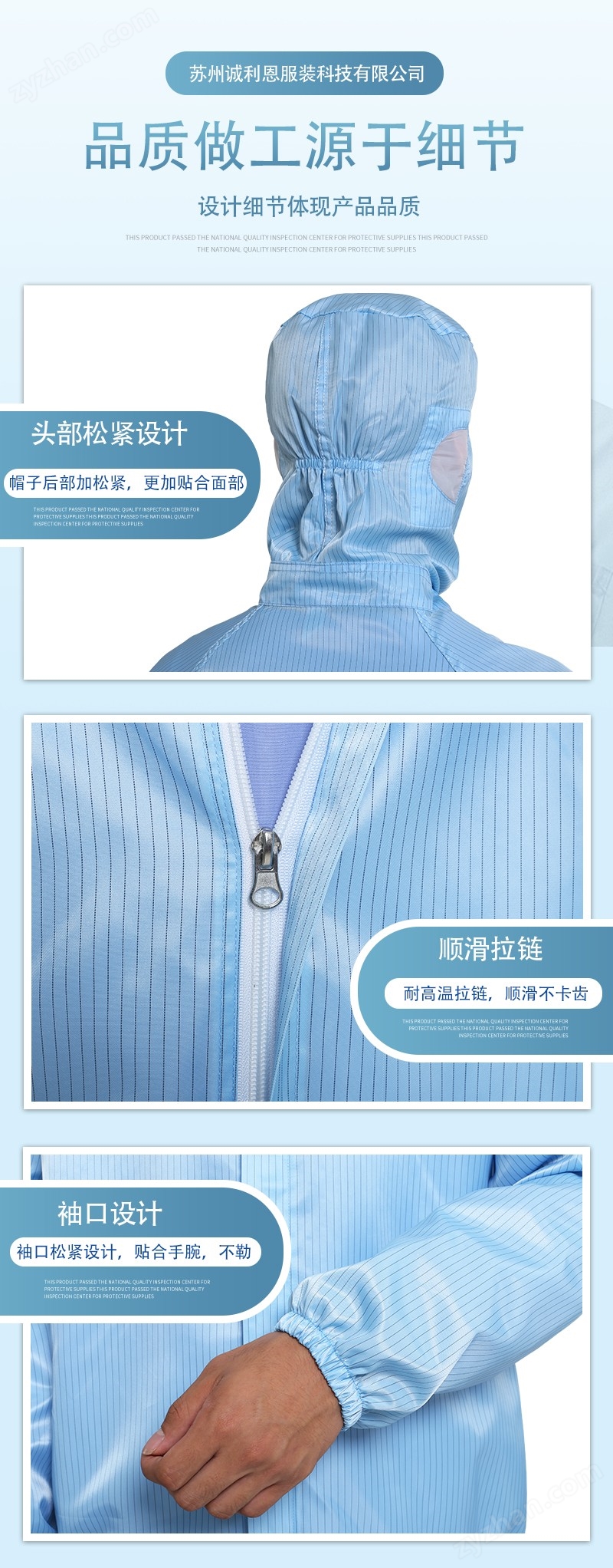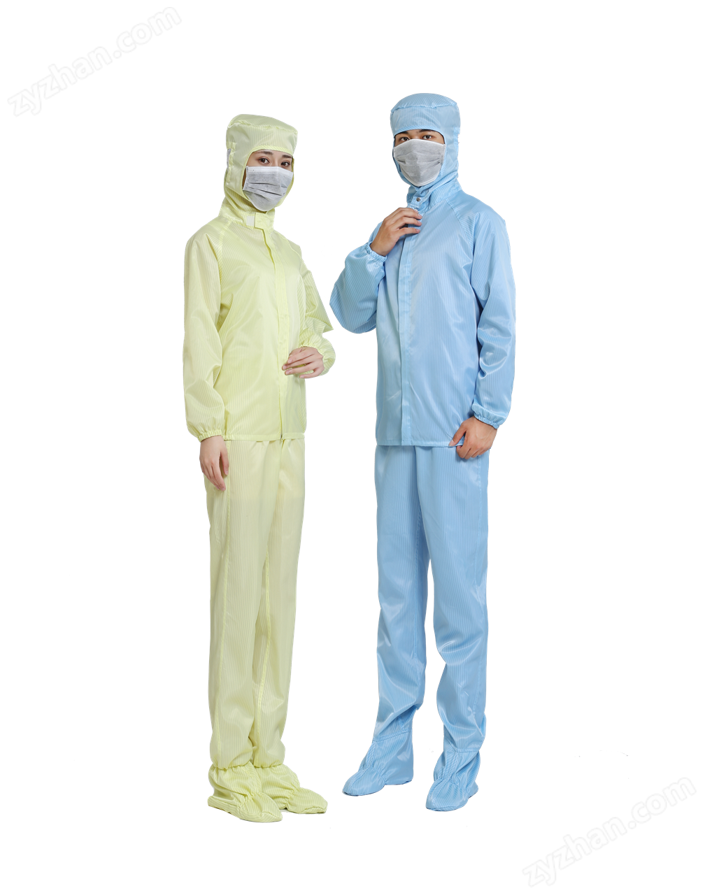 Split pharmaceutical dust-free clothingA jacket style1/2 diagonal 0.5 stripe anti-static fabric: long filament polyester brazing+conductive filament fiber; High quality crocheted elastic with YKK high temperature and humidity resistant sterilization zipper.